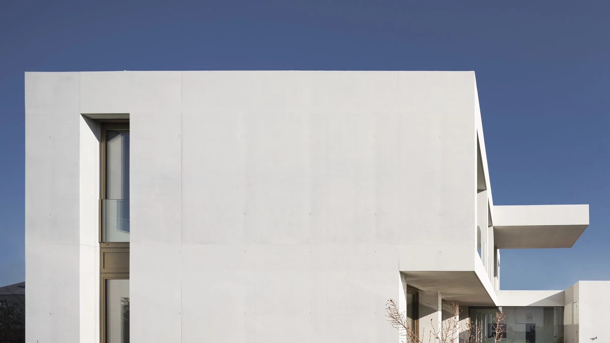 Hochwertige Sichtbetonflächen prägen die Außenwirkung. Sie wirken ruhig, glatt und präzise verarbeitet. Großformatige Glasflächen bringen Licht ins Haus und schaffen visuelle Verbindungen zur Umgebung. Pulverbeschichtete Aluminiumrahmen fassen die Verglasungen klar ein, ohne sich in den Vordergrund zu drängen. Die Innenräume bestückt mit Böden aus Holz, die dem klaren Gesamtbild eine warme, wohnliche Note hinzufügen. In den Nassbereichen sind Terrazzoböden verlegt, fein gekörnt, elegant und funktional. Die gezielte Auswahl und Kombination dieser Materialien unterstützt die architektonische Sprache des Hauses und wirkt integrativ statt dekorativ.